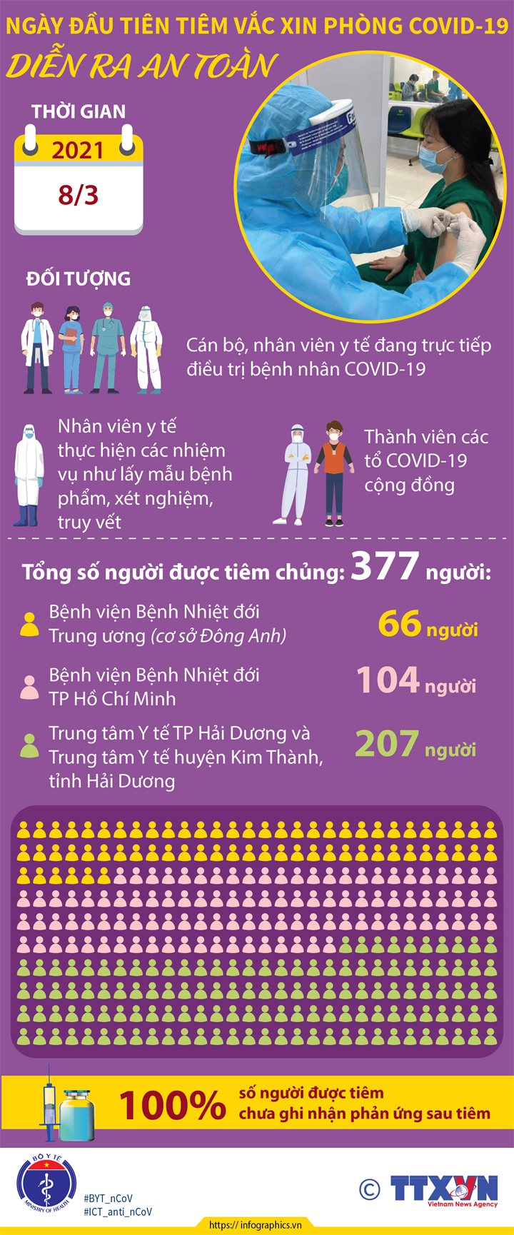 Theo thông tin từ Chương trình Tiêm chủng mở rộng Quốc gia, hoạt động tiêm chủng vắc xin phòng COVID-19 tại cả 4 điểm tiêm chủng trong ngày đầu tiên đều diễn ra an toàn với tổng cộng 377 người tiêm. 100% số người được tiêm chưa ghi nhận phản ứng sau tiêm.