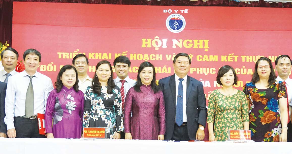 Bộ trưởng Nguyễn Thị Kim Tiến chứng kiến Lễ ký cam kết đổi mới phong cách , thái độ phục vụ của cán bộy tế hướng tới sự hài lòng của người bệnh tại Bệnh viện Bạch Mai.