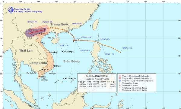 Trung tâm dự báo khí tượng thuỷ văn TƯ cho biết, sau khi đi vào vùng biên giới Cao Bằng - Lạng Sơn, cơn bão số 4 đã suy yếu thành áp thấp nhiệt đới, gây mưa cho khắp khu vực Bắc Bộ, nguy cơ lũ quét và sạt lở đất xảy ra trên các sông suối miền núi là rất lớn. Vào hồi 4 giờ sáng nay, 25/7, vị trí tâm áp thấp nhiệt đới ở vào khoảng 22,4 độ Vĩ Bắc; 106,7 độ Kinh Đông, trên khu vực biên giới Cao Bằng - Lạng Sơn. Sức gió mạnh nhất ở vùng gần tâm áp thấp nhiệt đới mạnh cấp 6 (tức là từ 39 đến 49 km một giờ), giật cấp 7.