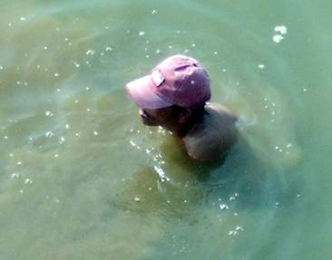 Anh Hùng đang ngâm mình dưới nước để mò nghêu. |