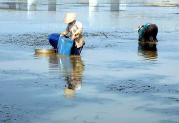 Những phụ nữ đang cặm cụi ở bãi nghêu. |