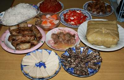 Cả một khoảng sân rộng trăm mét vuông được kê 4 dãy bàn dài dằng dặc. Các món đã được bày sẵn trên đó. Cỗ quê ngoài món truyền thống - thịt gà - thì bây giờ những món ăn ở phố thị cũng được cập nhật. Nào là thịt lợn hun khói; salat Nga; súp khai vị; cá quả bọc bạc nướng... Nhưng thịt lợn vẫn chiếm tuyệt đối. Đâu đâu cũng thấy thịt: thịt lợn xào, thịt  lợn luộc, thị lợn nướng chả..., bát canh măng cũng nổi lèo phèo vài ba miếng mỡ lợn...