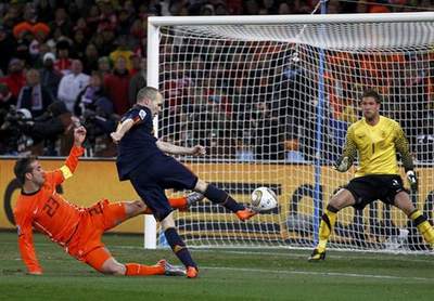 Pha lập công duy nhất của Iniesta ở phút 117 - hiệp phụ thứ hai đã giúp Tây Ban Nha (TBN) đăng quang ngôi vô địch World Cup 2010. Đây là lần đầu tiên đội bóng xứ sở bò tót bước lên đỉnh vinh quang của bóng đá thế giới trong niềm vui vô bờ của chính họ cũng như những tín đồ của trường phái bóng đá đẹp.