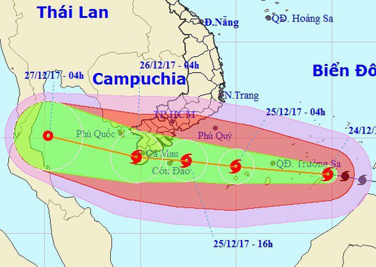 Đến 4 giờ ngày 25/12, vị trí tâm bão số 16 ở vào khoảng 8,5 độ Vĩ Bắc; 110,0 độ Kinh Đông, trên khu vực phía Tây quần đảo Trường Sa, cách Côn Đảo 380 km về phía Đông. Sức gió mạnh nhất ở vùng gần tâm bão mạnh cấp 12 (115-135 km/giờ), giật cấp 15, sóng biển cao từ 8-10 m.