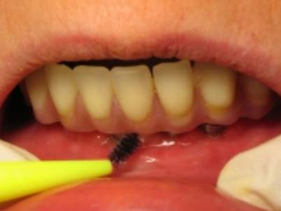 Sử dụng bàn chải kẽ để vệ sinh hàm giả trên implant nha khoa. |