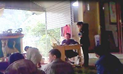 Ông Phi (người ngồi bàn) đang làm lễ cúng để đuổi tà cho một con bệnh (ảnh chụp từ video). |