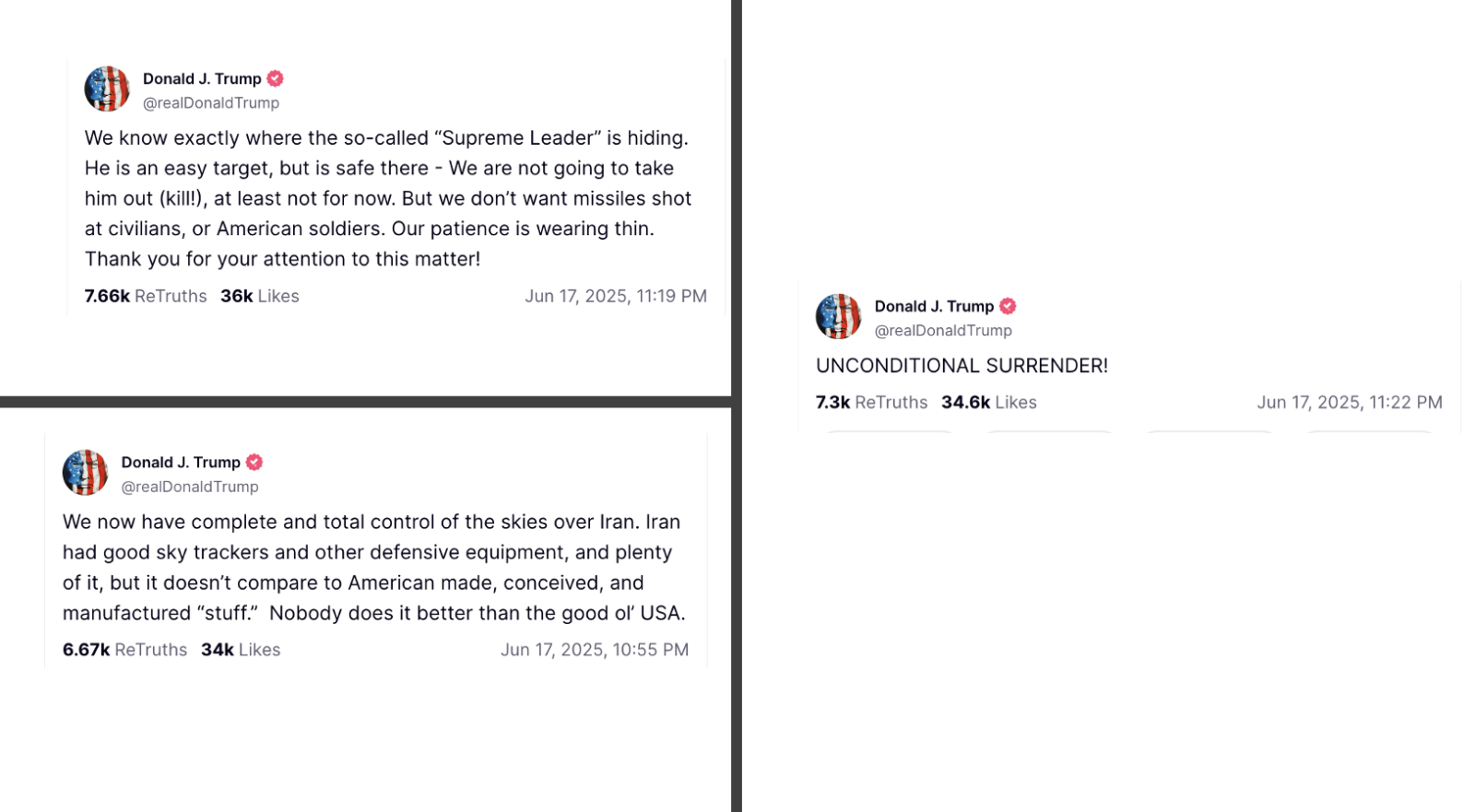 Loạt bài đăng trên mạng xã hội Truth Social của Tổng thống Mỹ Donald Trump vào tối 17/6/2025 về vấn đề Iran. Ảnh chụp màn hình