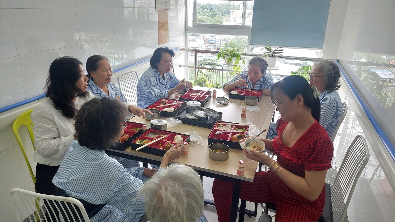 Chị Hà (bìa trái) thường nhín thời gian trưa để vào ăn cơm cùng mẹ.