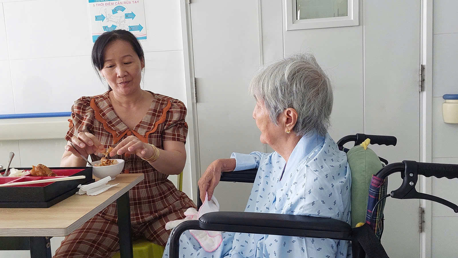 Gần 3 tháng, chị Thảo trưa nào cũng đút cơm cho mẹ chồng là cụ Nguyễn Thị Oảnh (77 tuổi).