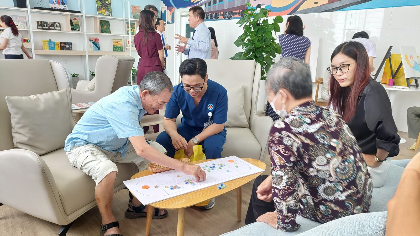 Các cụ ông, cụ bà khuây khỏa tinh thần bằng nhiều hình thức ở phòng Tâm thể.