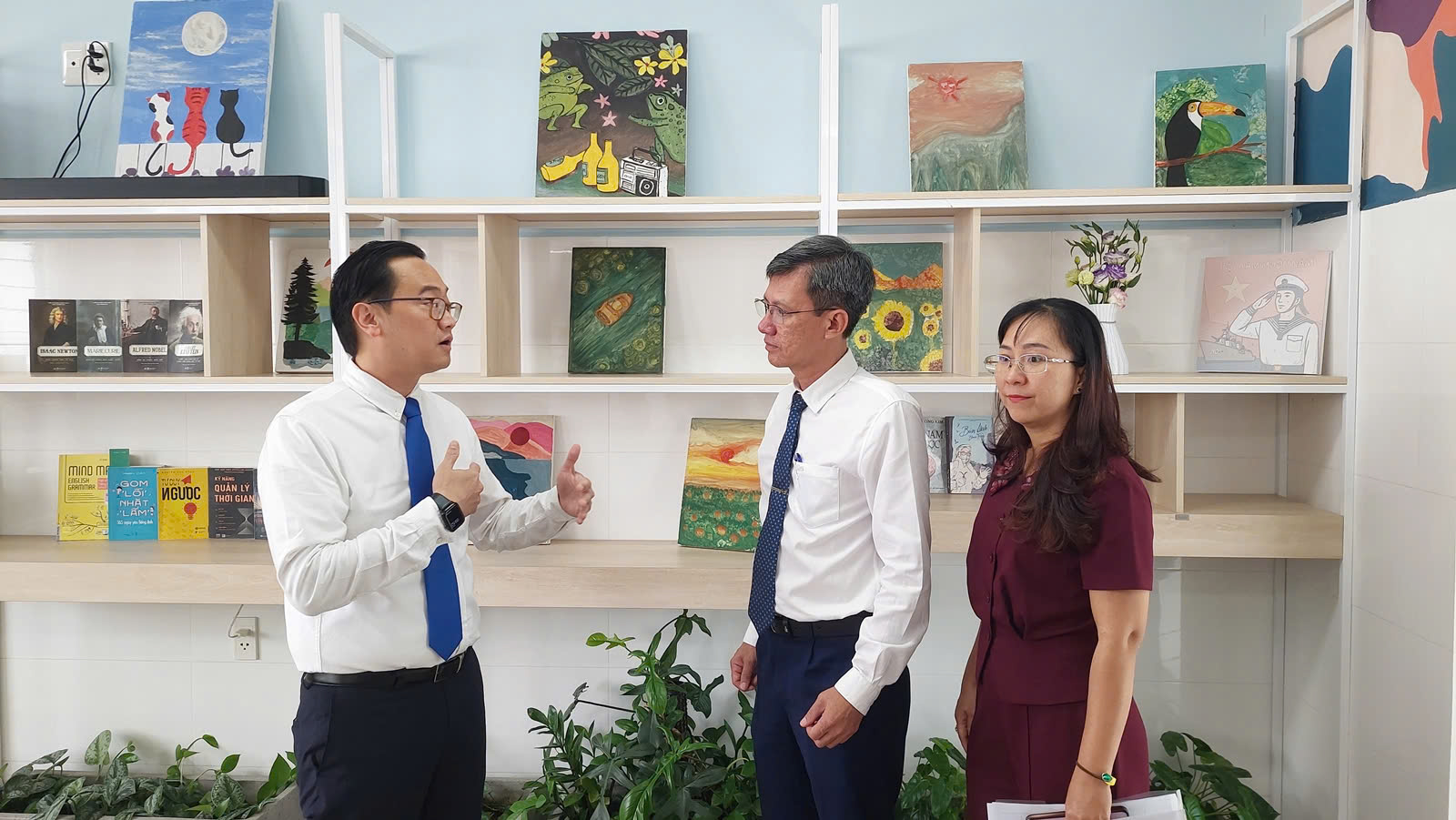 PGS.TS.BS Phan Minh Hoàng (trái) giới thiệu mô hình với lãnh đạo chính quyền địa phương.
