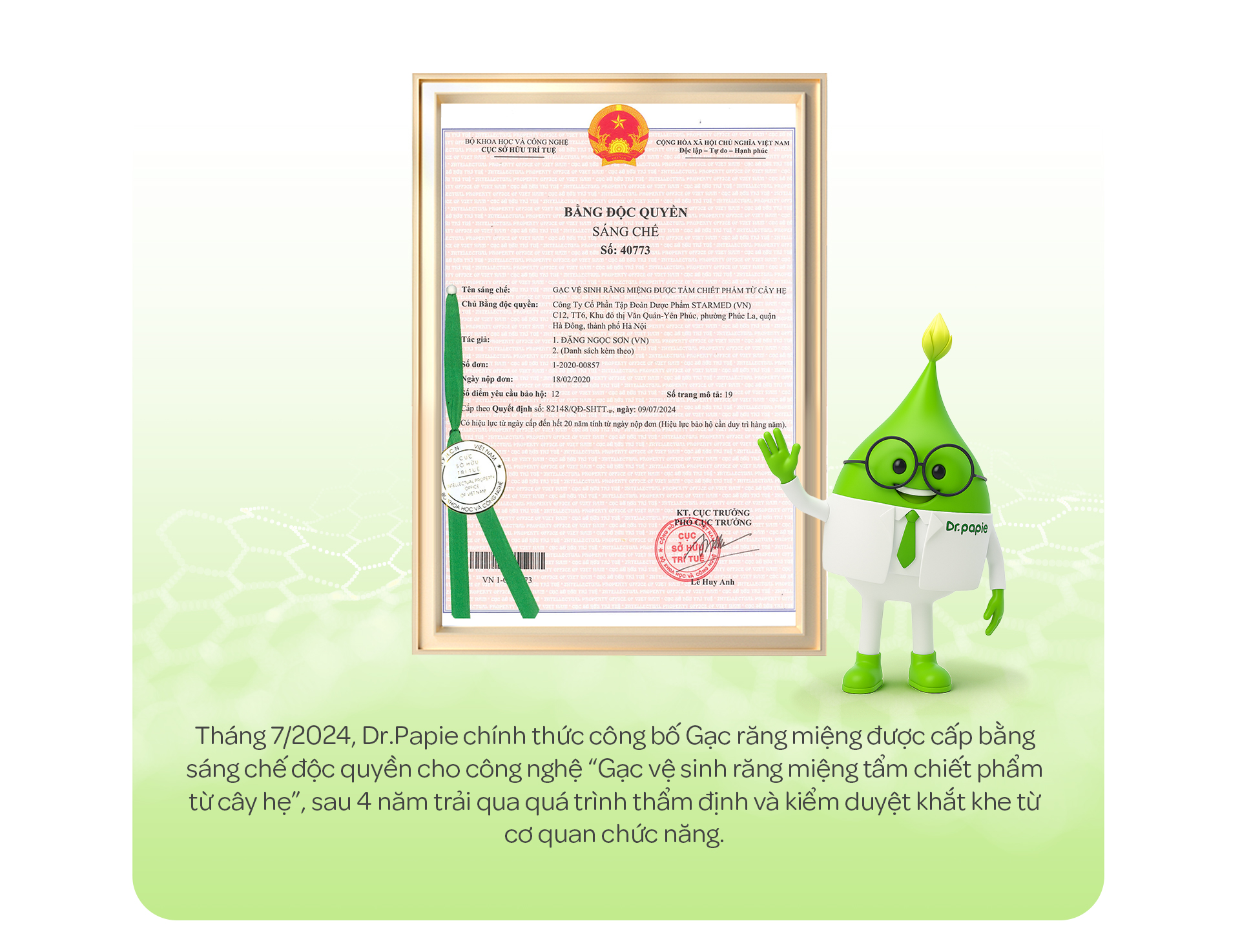 Tháng 7/2024, Dr.Papie chính thức công bố Gạc răng miệng được cấp bằng Sáng chế độc quyền cho công nghệ "Gạc vệ sinh răng miệng tẩm chiết phẩm từ cây hẹ", sau 4 năm trải qua quá trình thẩm định và kiểm duyệt khắt khe từ cơ quan chức năng. Đây là sáng chế trong lĩnh vực chăm sóc răng miệng trẻ em ứng dụng dược liệu thiên nhiên dưới dạng gạc tẩm ẩm dùng một lần. Công bố này đánh dấu bước chuyển quan trọng, khi các sản phẩm dành cho trẻ em "Made in Việt Nam" đã bắt đầu tạo được lợi thế công nghệ cốt lõi, khẳng định khả năng nghiên cứu và đổi mới sáng tạo.