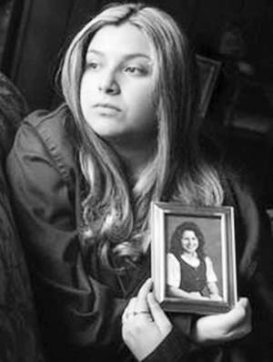 Evelyn Arciniega, con gái của Gloria Ramirez với di ảnh của mẹ. |