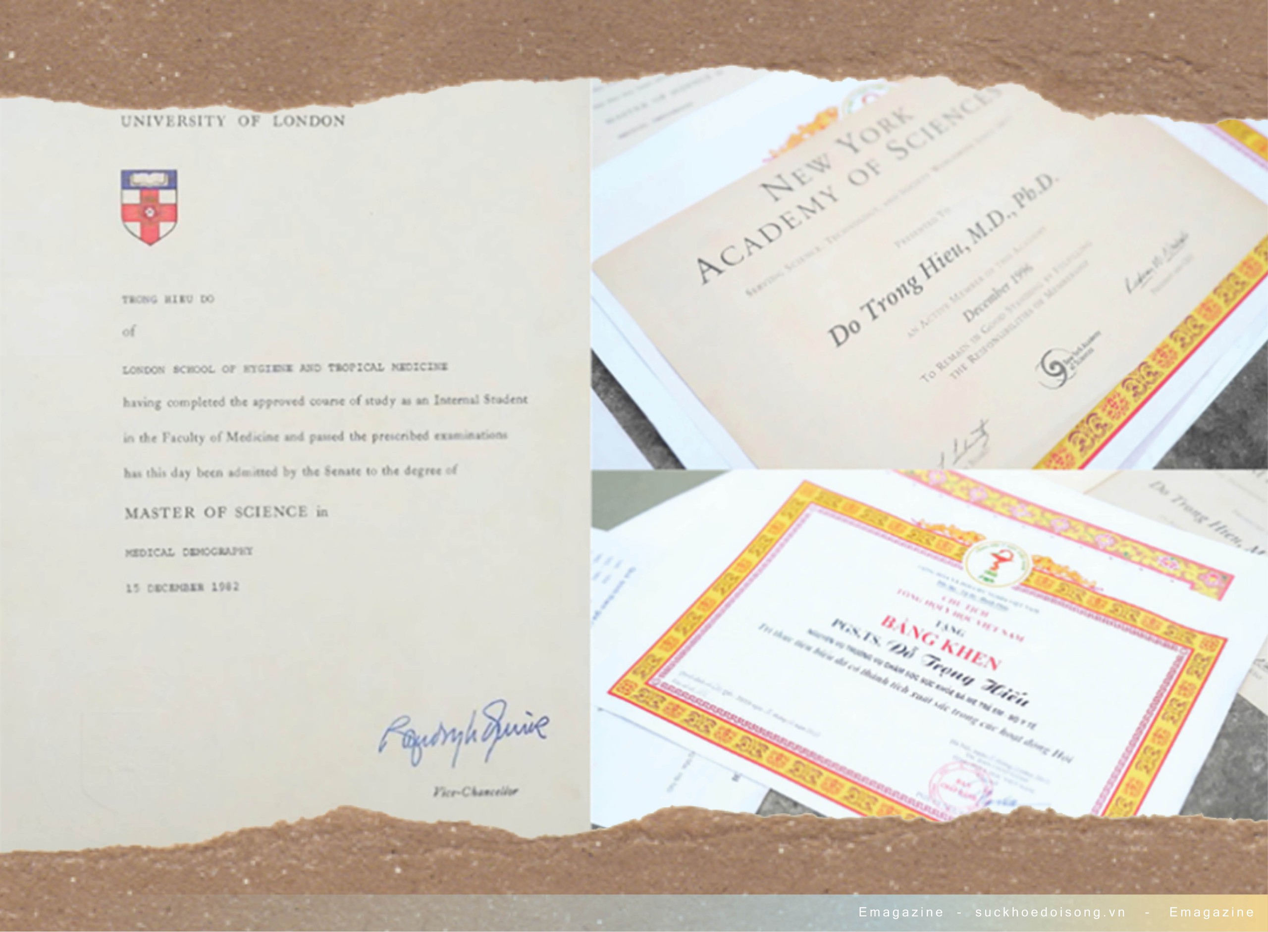 Bằng cấp của GS ở nước ngoài cũng như bằng khen được nhà nước và các ban ngành đoàn thể trao tặng ghi nhận công lao của ông.