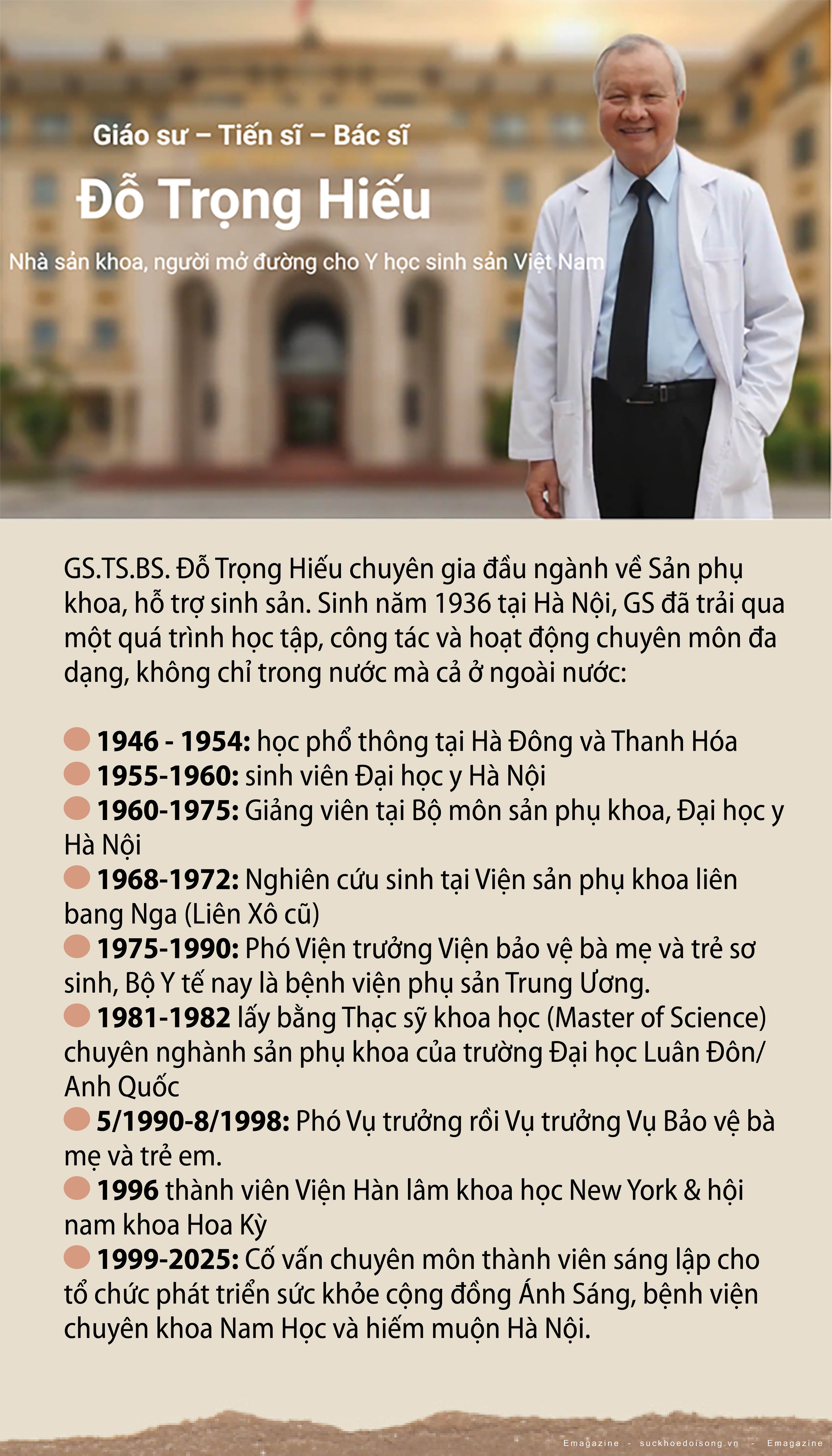 Hơn bảy thập kỷ gắn bó với nghề, cuộc đời và sự nghiệp của GS.TS.BS Đỗ Trọng Hiếu là biểu tượng của trí tuệ, nhân cách và lòng tận tụy với y học sinh sản. GS. không chỉ chăm sóc bảo vệ sức khỏe của bà mẹ trẻ em, không chỉ đem tiếng cười trẻ thơ đến mái ấm hạnh phúc với những gia đình hiếm muộn, mà còn gieo hạt giống tri thức và nhân ái trong từng thế hệ thầy trò. Một cuộc đời hiến dâng trọn vẹn cho nền khoa học vì sức khỏe con người...