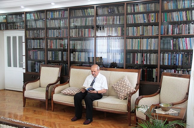 Hiệu trưởng Cao đẳng Khoa học Kayser Ozmerdivenli đang đọc sách trong thư viện riêng