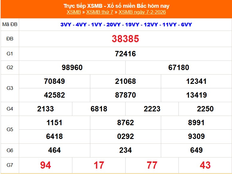 Kết quả xổ số miền Bắc ngày 7/2/2026 - Kết quả XSMB ngày 7/2.