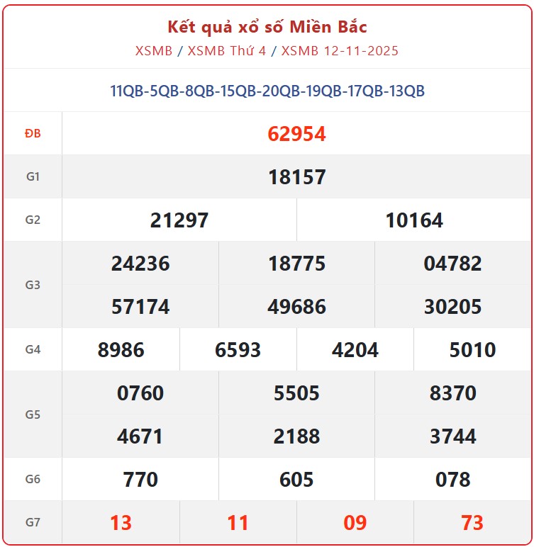 XSMB 13/11 - Kết quả xổ số miền Bắc hôm nay - Trực tiếp kết quả xổ số miền Bắc thứ 5 ngày 13/11/2025 - KQXSMB ngày 13/11 - Kết quả xổ số miền Bắc 13/11.