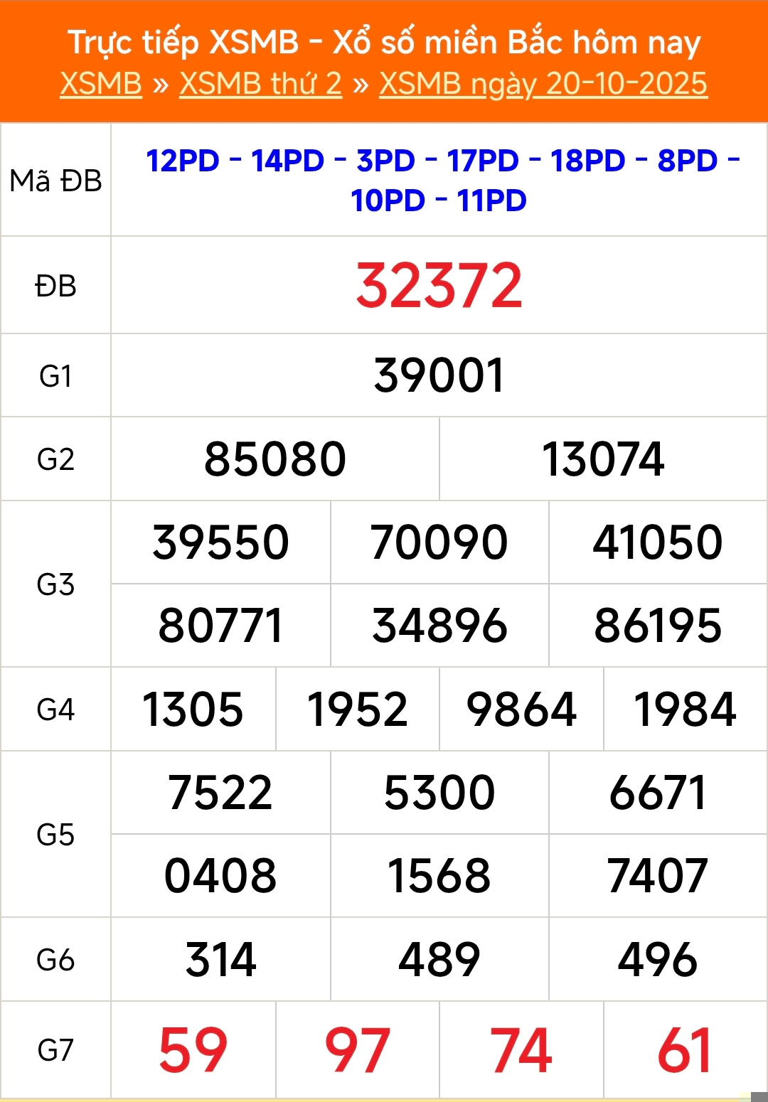 Kết quả xổ số miền Bắc ngày 20/10/2025 - Kết quả XSMB ngày 20/10.