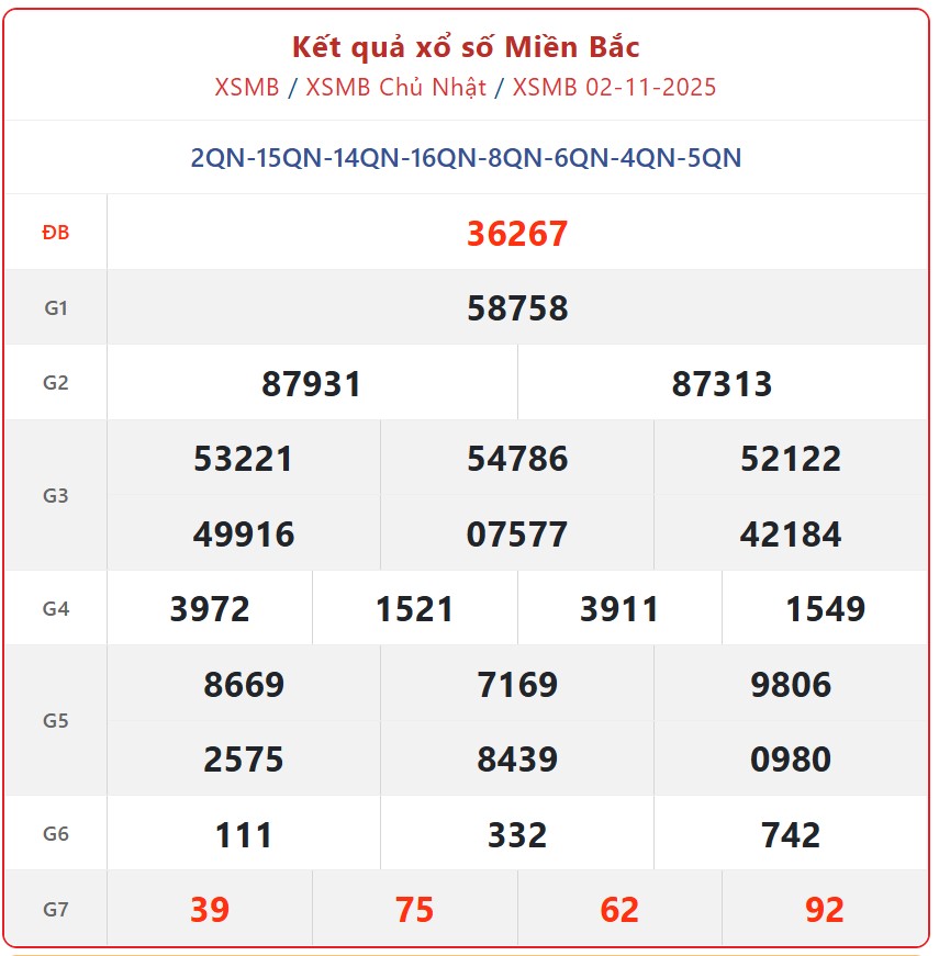 Theo dõi kết quả xổ số miền Bắc hôm nay 3/11 /2025 và kết quả XSMB mỗi ngày, kết quả xổ số miền Bắc hôm nay - XSMB thứ 2 ngày 3/11/2025, kết quả xổ số miền Bắc ngày 3/11, KQXSMB 3/11 để cập nhật kết quả sớm nhất.