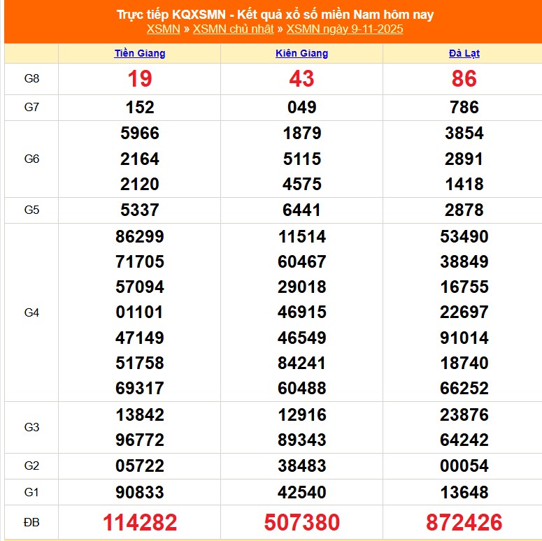 Kết quả xổ số miền Nam hôm nay - kết quả XSMN thứ Tư ngày 12/11/2025 được cập nhật trực tiếp. Các giải thưởng của XSMN ngày 12/11 sẽ được công bố lần lượt từ giải nhất cho đến giải tám, cuối cùng là giải đặc biệt.