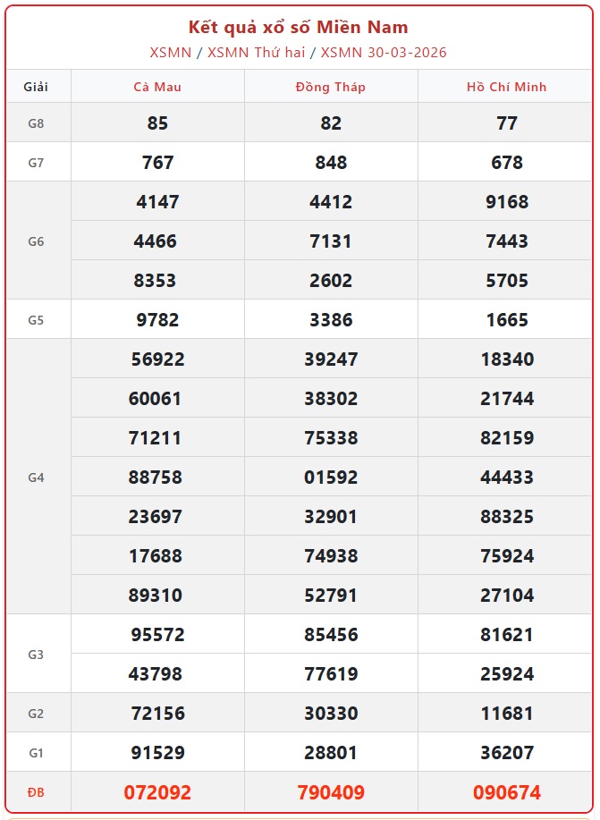 Theo dõi kết quả XSMN hôm nay 31/3/2026 và kết quả xổ số miền Nam hàng ngày, kết quả xổ số miền Nam hôm nay - XSMN thứ 3 ngày 31/3/2026, kết quả xổ số miền Nam ngày 31/3, KQXSMN 31/3 để cập nhật kết quả sớm nhất.