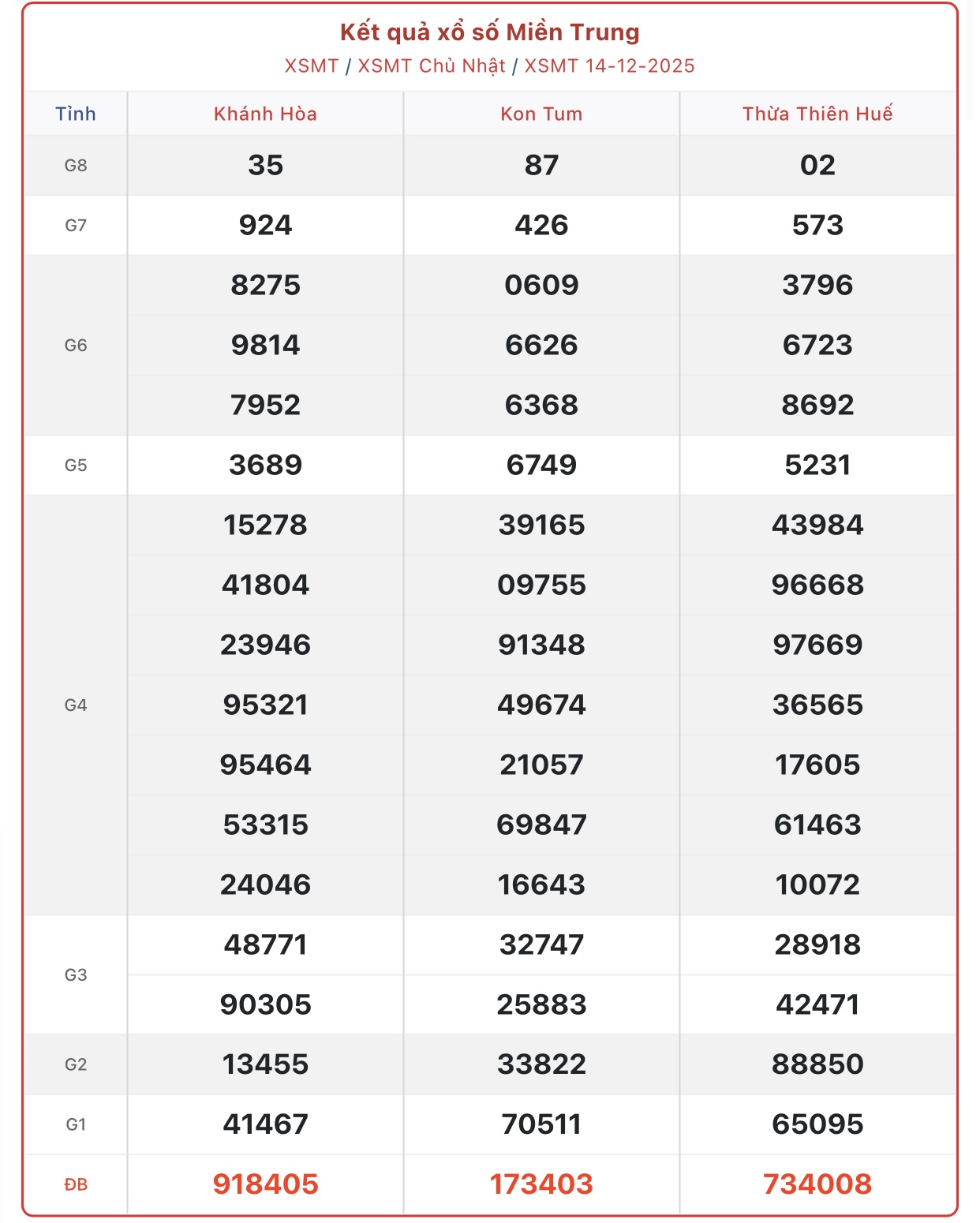 Theo dõi kết quả xổ số miền Trung hôm nay 15/12/2025 và kết quả XSMT mỗi ngày, kết quả xổ số miền Trung hôm nay - XSMT thứ 2 ngày 15/12/2025, kết quả xổ số miền Trung ngày 15/12, KQXSMT 15/12 để cập nhật kết quả sớm nhất.