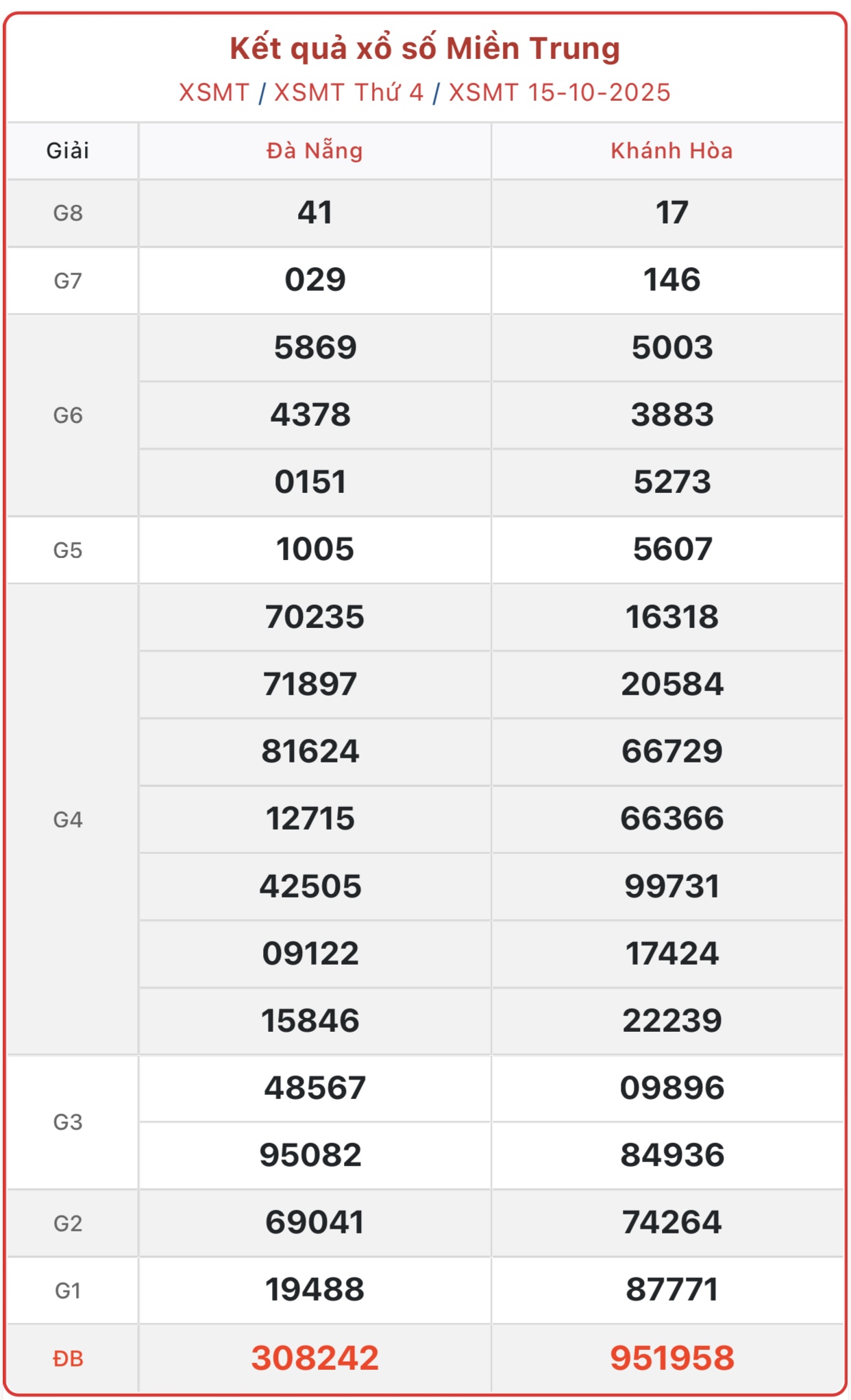 Kết quả xổ số miền Trung hôm nay - XSMT thứ Năm ngày 16/10/2025 sẽ được cập nhật trực tiếp. Các giải thưởng của XSMT ngày 16/10 sẽ được công bố lần lượt từ giải nhất cho đến giải tám, cuối cùng là giải đặc biệt.
