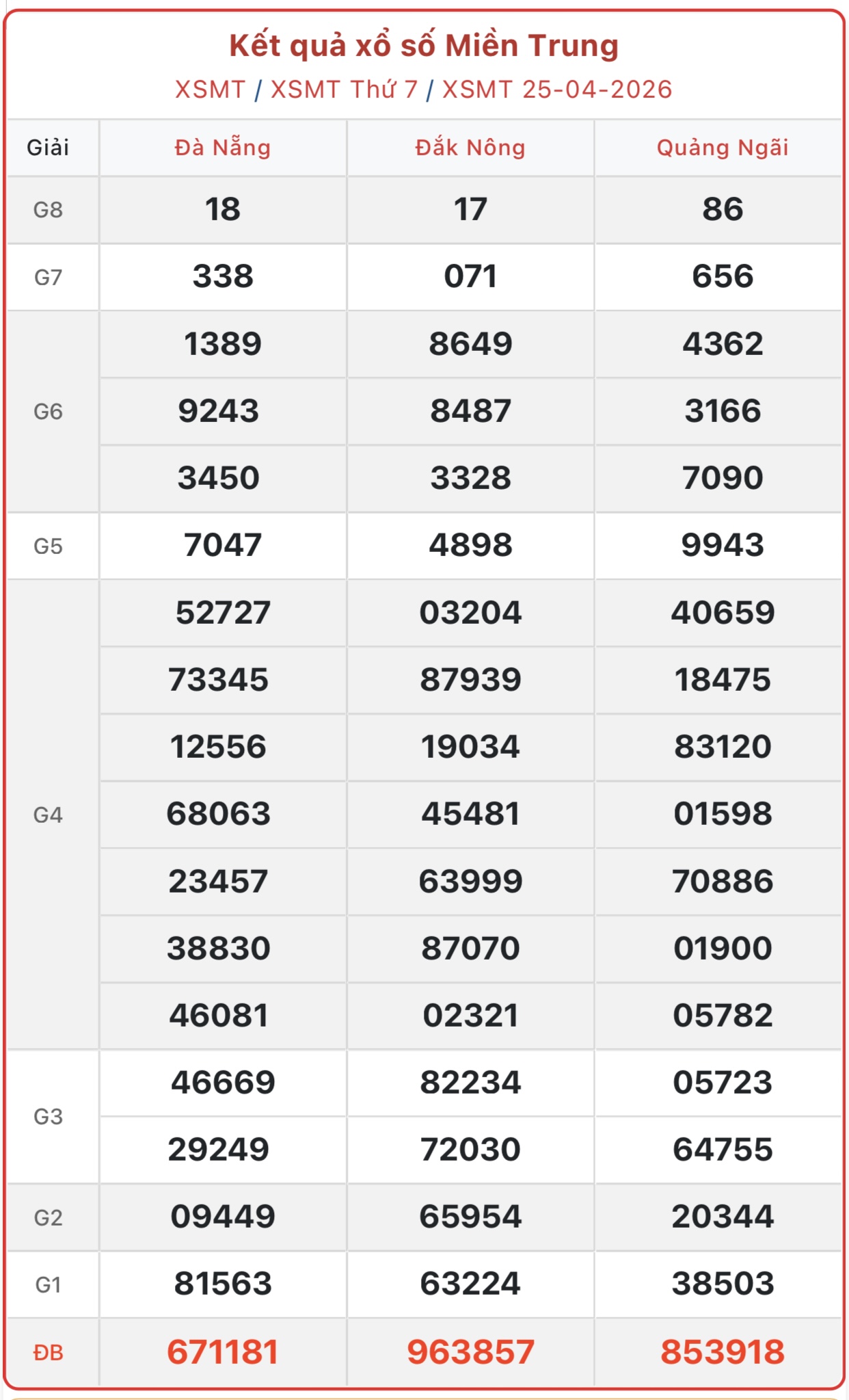 Kết quả xổ số miền Trung hôm nay - XSMT Chủ nhật ngày 26/4/2026 sẽ được cập nhật trực tiếp. Các giải thưởng của XSMT ngày 26/4 sẽ được công bố lần lượt từ giải nhất cho đến giải tám, cuối cùng là giải đặc biệt.