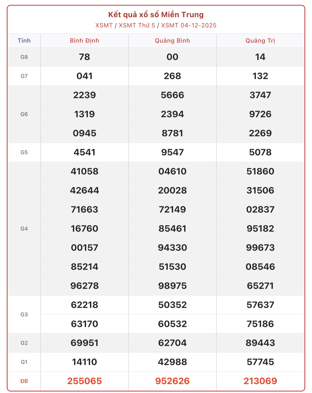 Theo dõi kết quả xổ số miền Trung hôm nay 5/12/2025 và kết quả XSMT mỗi ngày, kết quả xổ số miền Trung hôm nay - XSMT thứ 6 ngày 5/12/2025, kết quả xổ số miền Trung ngày 5/12, KQXSMT 5/12 để cập nhật kết quả sớm nhất.