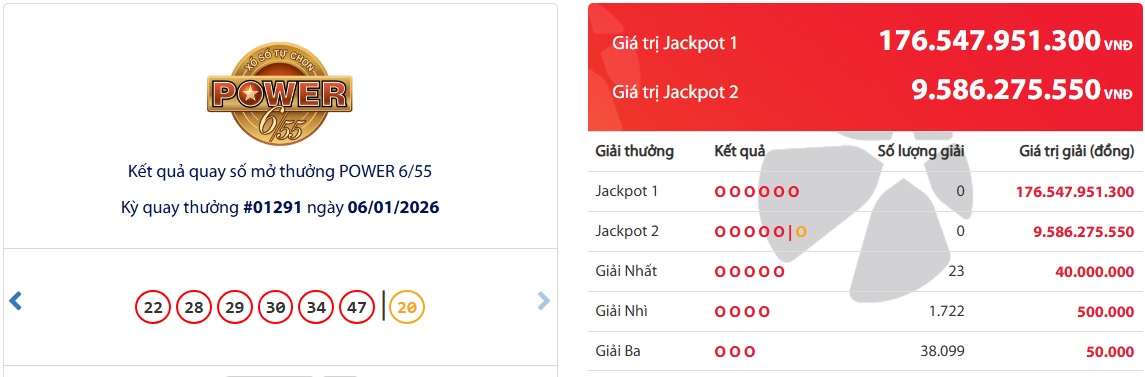 Theo dõi kết quả xổ số Vietlott Power 6/55 thứ 3 ngày 13/1, kết quả xổ số Vietlott hôm nay 13/1/2026, kết quả xổ số Vietlott ngày 13/1, kết quả Vietlott hàng ngày được cập nhật nhanh chóng, đầy đủ và chính xác, theo dõi KQXS Vietlott mới nhất để không bỏ lỡ thời gian nhận thưởng.