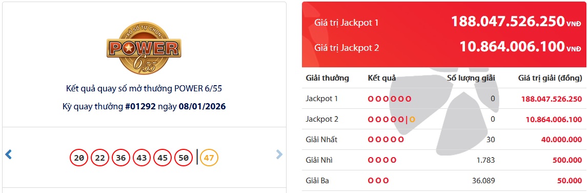 - Kết quả Vietlott Power 6/55 8/1 - Kết quả xổ số Vietlott ngày 8/1