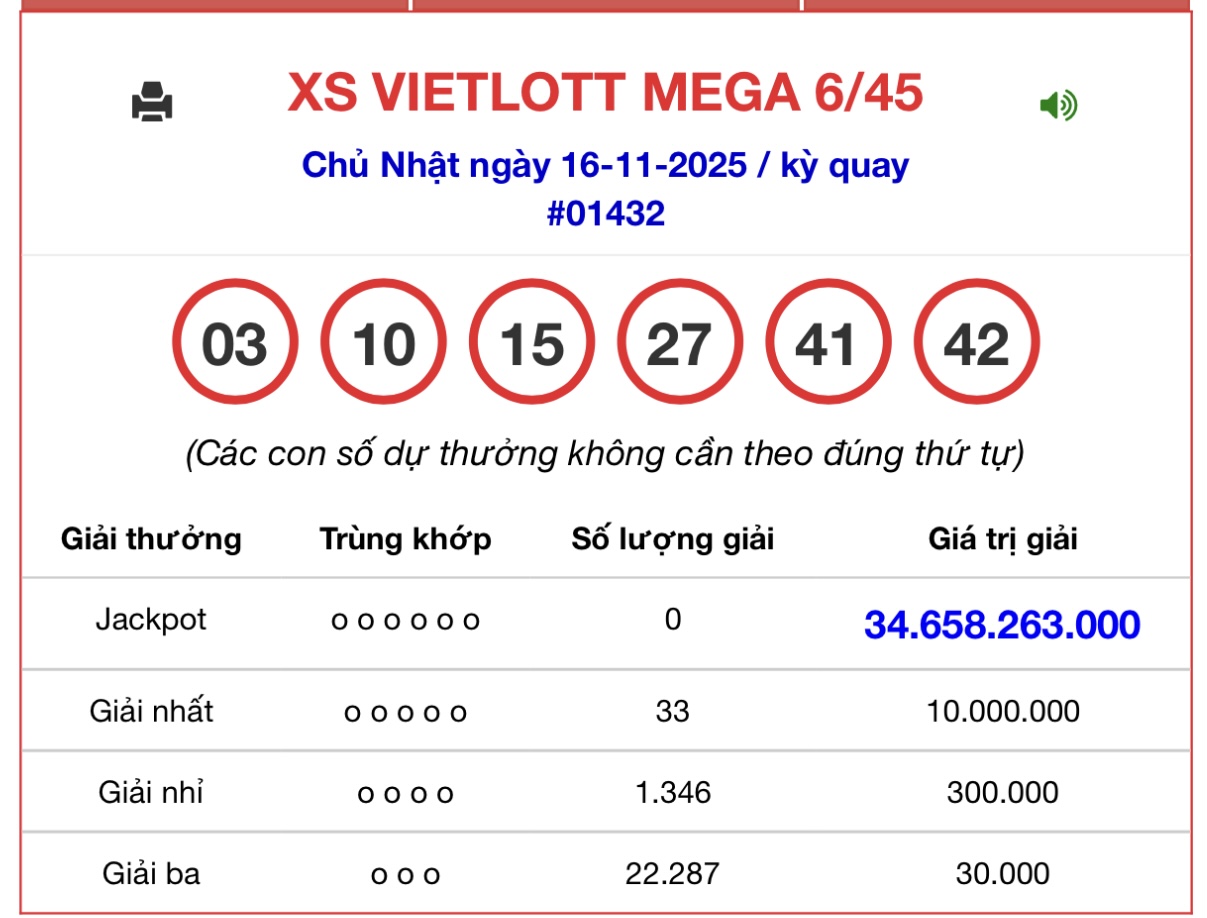 - Kết quả Vietlott Mega 6/45 16/11 - Kết quả xổ số Vietlott ngày 16/11.