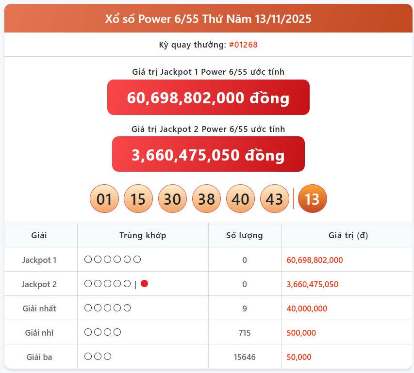 Kết quả xổ số Vietlott ngày 13/11/2025 - Kết quả Vietlott Power 6/55 ngày 13/11.