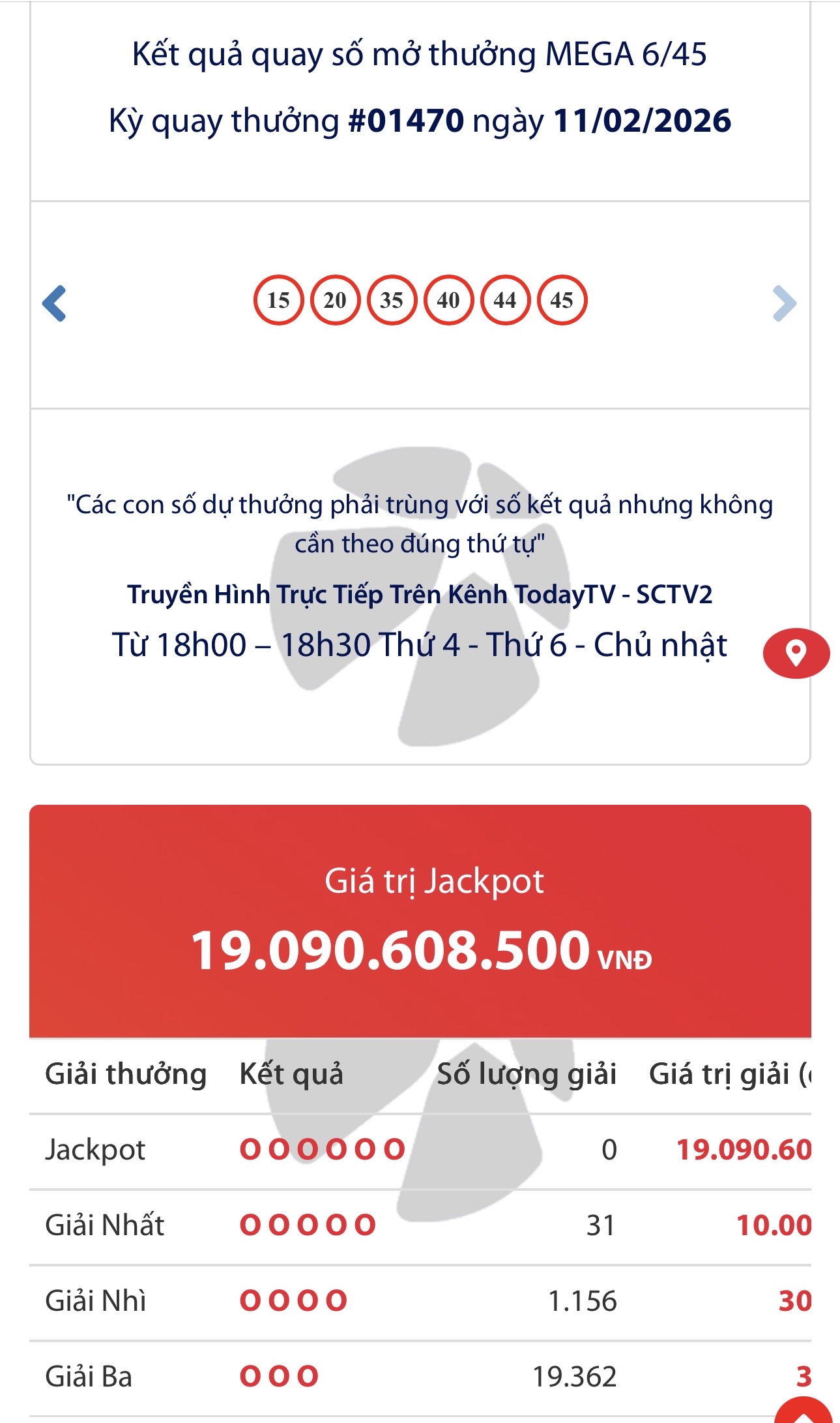 Kết quả xổ số Vietlott ngày 11/2 /2026 - Kết quả Vietlott Mega 6/45 ngày 11/2 .