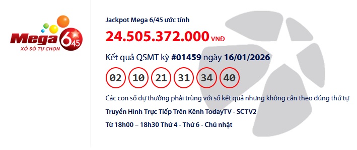 Kết quả xổ số Vietlott ngày 16/1/2026 - Kết quả Vietlott Mega 6/45 ngày 16/1.