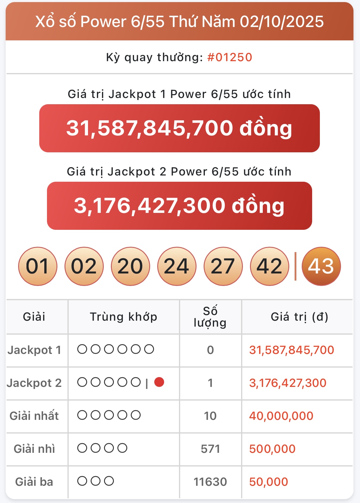 Kết quả xổ số Vietlott ngày 2/10/2025 - Kết quả Vietlott Power 6/55 ngày 2/10.
