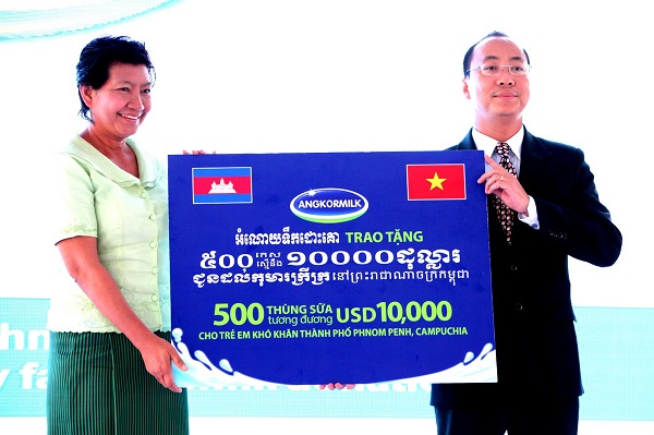 Tại chương trình, ông Đoàn Quốc Khánh – Tổng Giám đốc Nhà máy Sữa Angkor đại diện Nhà máy đã gửi đến cho trẻ em nghèo của Phnompenh 500 thùng sữa nước trị giá tương đương 10.000 USD để góp phần cải thiện tình trạng dinh dưỡng cho trẻ em Campuchia.