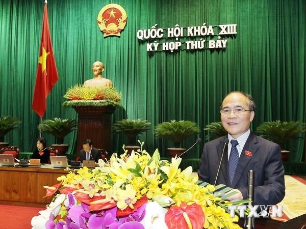 Phát biểu khai mạc Kỳ họp thứ 7, Chủ tịch Quốc hội Nguyễn Sinh Hùng nhấn mạnh, kỳ họp lần này diễn ra trong bối cảnh tình hình khu vực và thế giới có nhiều diễn biến phức tạp, kinh tế thế giới phục hồi chậm, tuy nhiên kinh tế trong nước chuyển biến tích cực, lạm phát được kiềm chế, tỷ giá ổn định, dự trữ ngoại tệ tăng khá. Tuy vậy, kinh tế vĩ mô chưa thật ổn định, tái cơ cấu nền kinh tế chuyển biến chậm, đang xuất hiện khó khăn mới, cần có giải pháp đồng bộ, sử dụng hợp lý, có hiệu quả các nguồn lực của đất nước. Chủ tịch Quốc hội nhận định, tình hình ở biển Đông đang diễn biến hết sức phức tạp và khó lường. Việc Trung Quốc hạ đặt giàn khoan trái phép với tàu chiến và máy bay bảo vệ là vi phạm đặc biệt nghiêm trọng chủ quyền lãnh thổ Việt Nam, vi phạm luật pháp quốc tế. Tại kỳ họp này, Quốc hội sẽ nghe và thảo luận về tình hình biển Đông, tinh thần là bằng mọi biện pháp, với đường lối hòa bình, kiên quyết bảo vệ chủ quyền quốc gia, phù hợp với luật pháp quốc tế,