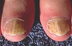 Vi nấm có thể xâm lấn móng bằng cách thâm nhập từ dưới móng, từ bờ xa hay ở bờ gần (sát ngay da móng) làm cho móng không còn vẻ bóng, giòn ra, dày lên và màu bẩn, phần dưới móng có bột vụn, trên móng có rãnh, lỗ chỗ. Lâu dần móng bị vẹm, phần còn lại xù xì, vàng đục. Cũng có khi vi nấm xâm nhập thẳng vào phiến móng từ phía trên làm thành các mảng móng mất màu dạng bột trắng (hay gặp ở trẻ em) gọi là nấm móng trắng nông. Đa số phát hiện các trường hợp nấm móng hiện nay là dựa vào lâm sàng và soi kính hiển vi để dùng thuốc.