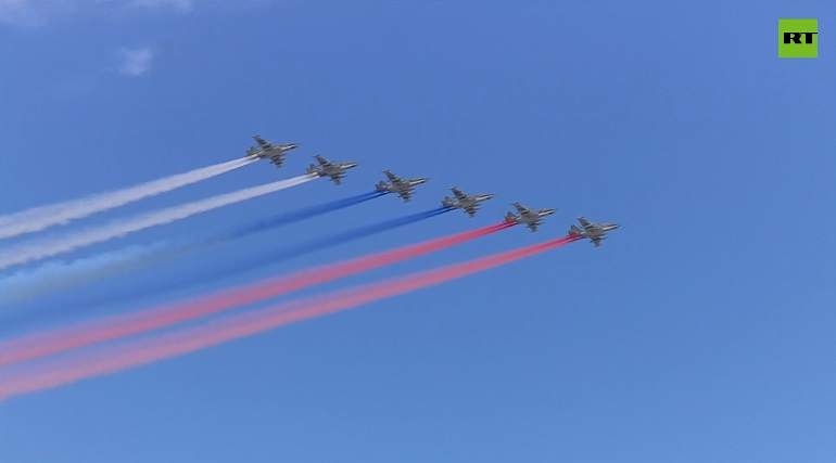 Sau đó là 6 cường kích Su-25BM xả khói màu, tạo thành quốc kỳ Nga trên bầu trời Quảng trường Đỏ, kết thúc Lễ duyệt binh Ngày Chiến thắng. Ảnh: RT