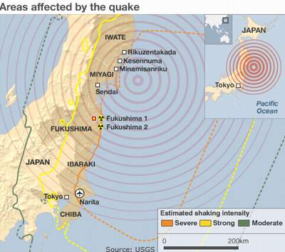 Vùng Sendai, nơi bị cơn địa chấn gây thiệt hại nghiêm trọng nhất có tổng cộng 11 trung tâm điện hạt nhân. Tất cả các lò phản ứng tối tân này đã ngưng vận hành một cách tự động. Tuy nhiên tình trạng của hai trung tâm gây lo ngại đặc biệt, nhất là sau khi có tiếng nổ tại một cơ sở. Đích thân Thủ tướng Naoto Kan ra lệnh di tản 45 ngàn dân trong bán kính 20km xung quanh trung tâm điện hạt nhân Fukushima số 1. Là nạn nhân của cơn địa chấn kỷ lục 8,9 trên thang điểm Richter và các dư chấn liên tục, hệ thống giảm nhiệt của một trong các lò phản ứng của trung tâm Fukushima số 1 không hoạt động được. Nhiệt độ gia tăng từ các lò phản ứng buộc quân đội Hoa Kỳ phải cung cấp hóa chất làm lạnh suốt đêm.