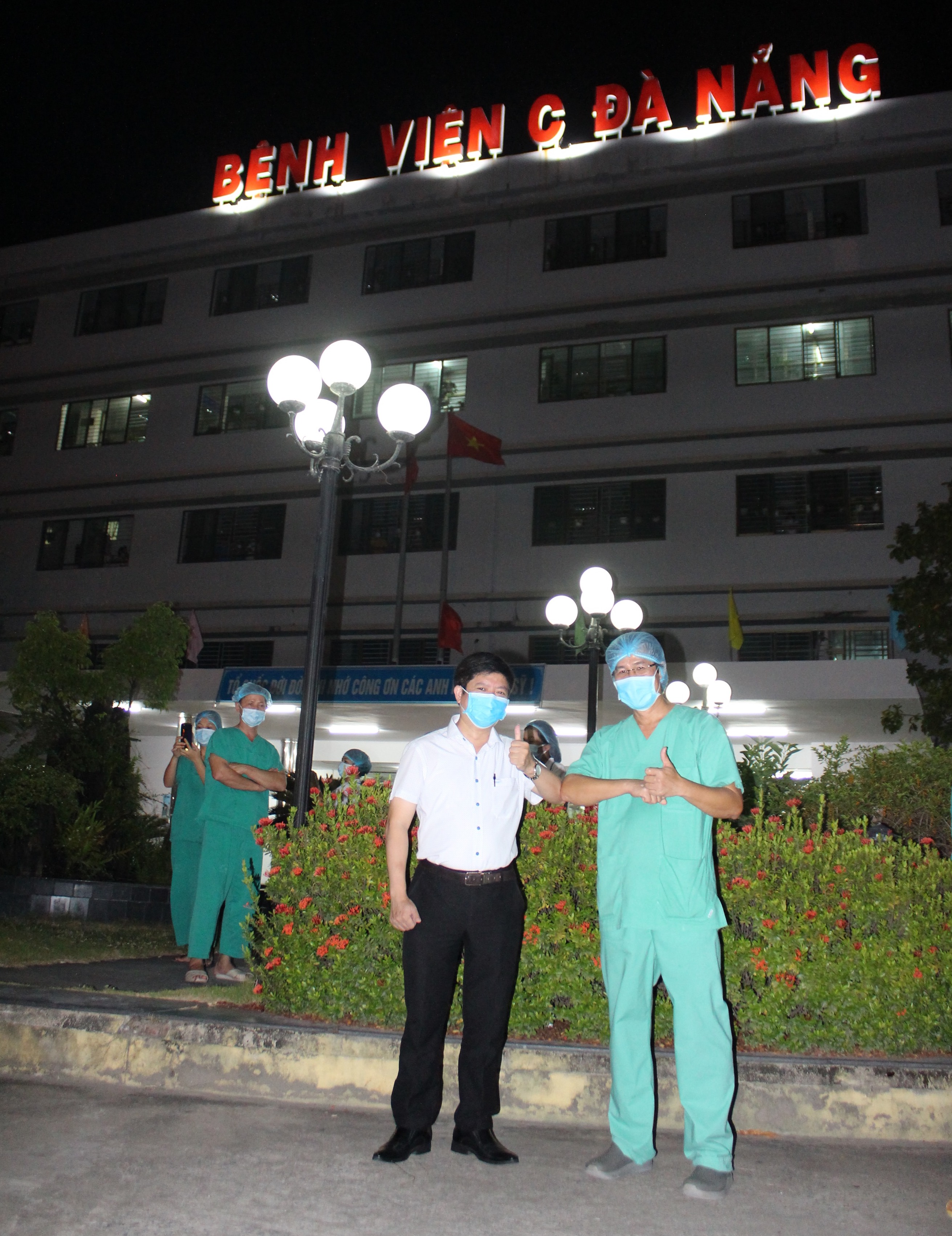 Ông Nguyễn Trọng Khoa, Phó Cục trưởng Cục Quản lý khám, chữa bệnh, Tổ trưởng tổ điều trị bệnh nhân Covid-19 tại Đà Nẵng chia sẻ niềm vui với cán bộ BV C Đà Nẵng khi bệnh viện được gỡ bỏ phong toả (ảnh Anh Văn chụp lúc 0h ngày 8/8 tại BV C Đà Nẵng).
