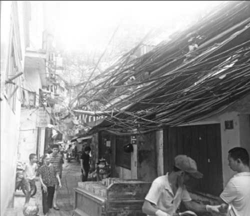 Những búi cáp dây điện, viễn thông quấn lấy nhau càng ngày càng... to, bởi mỗi khi có một hộ gia đình thay thế, chuyển dịch vụ hoặc đường dây bị đứt là các cán bộ kỹ thuật của các công ty cung cấp dịch vụ như điện lực, truyền hình cáp lại lập tức kéo dây mới và đương nhiên chỉ việc dùng kìm cắt phăng đầu dây cũ rồi để nguyên nó tại chỗ mà không kéo đi.