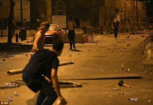 Sự hỗn loạn tiếp tục vào ban đêm trong khi cảnh sát chiến đấu với nhóm thanh niên bịt mặt đã lập rào chắn ở trung tâm Beirut và gần Nhà thờ Hồi giáo Mohammad al-Amin ở Quảng trường Martyrs.