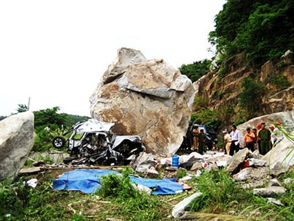 ![]() Toàn cảnh điểm sạt lở đè bẹp xe bị nạn tại vồ Cứu Nạn (núi Cấm). |