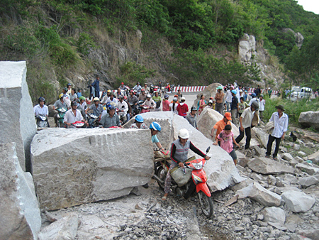 ![]() Do thiếu người chỉ huy, nên mãi đến 17h cùng ngày mới tạm thời mở được lối đi hẹp đủ cho xe môtô qua. |
