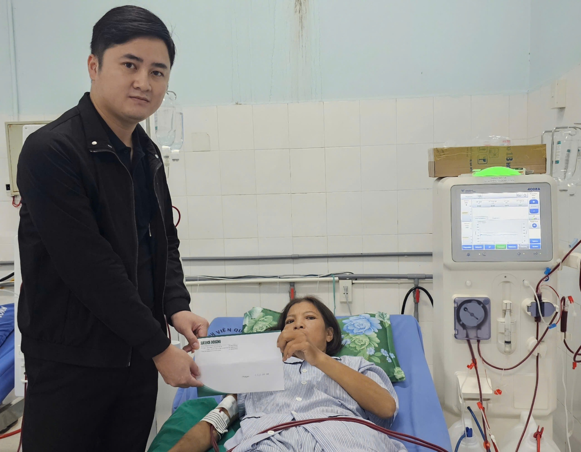 Đại diện Báo Sức khỏe và Đời sống trao tiền bạn đọc hỗ trợ đến gia đình chị Thủy. Hiện chị Thủy đang tiếp tục phải chạy thận tại bệnh viện.