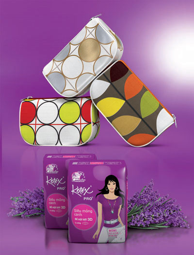 Từ 02/05/2011 đến 30/06/2011, khi mua 2 gói băng vệ sinh KOTEX PRO hương Lavender mới quý khách hàng sẽ được tặng ngay 1 ví thời trang sành điệu. Ví có 3 thiết kế trẻ trung, phong cách để bạn dễ dàng lựa chọn. Chương trình áp dụng cho KOTEX PRO loại siêu mỏng cánh gói 5 miếng (10.000 đồng), cánh gói 8 miếng (14.000 đồng) và không cánh gói 8 miếng (11.000 đồng). Hương Lavender cùng hương cúc thơm dịu trong KOTEX PRO mới có tác dụng khử mùi, mang lại hương thơm dễ chịu. Cùng những tính năng vượt trội của bề mặt lưới 3D và vùng thấm hút trung tâm tăng cường tốc độ thấm hút và ngăn thấm ngược trở lại, KOTEX PRO mang lại cảm giác khô thoáng tối đa, giúp các bạn gái trẻ, năng động luôn thoải mái, tự tin để có được những quyết định đúng đắn trong công việc và cuộc sống.