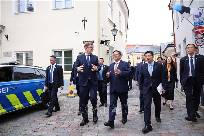 Thủ tướng Phạm Minh Chính và Thủ tướng Estonia Kristen Michal đi bộ trong khu phố cổ Tallinn. Ảnh: Dương Giang/TTXVN